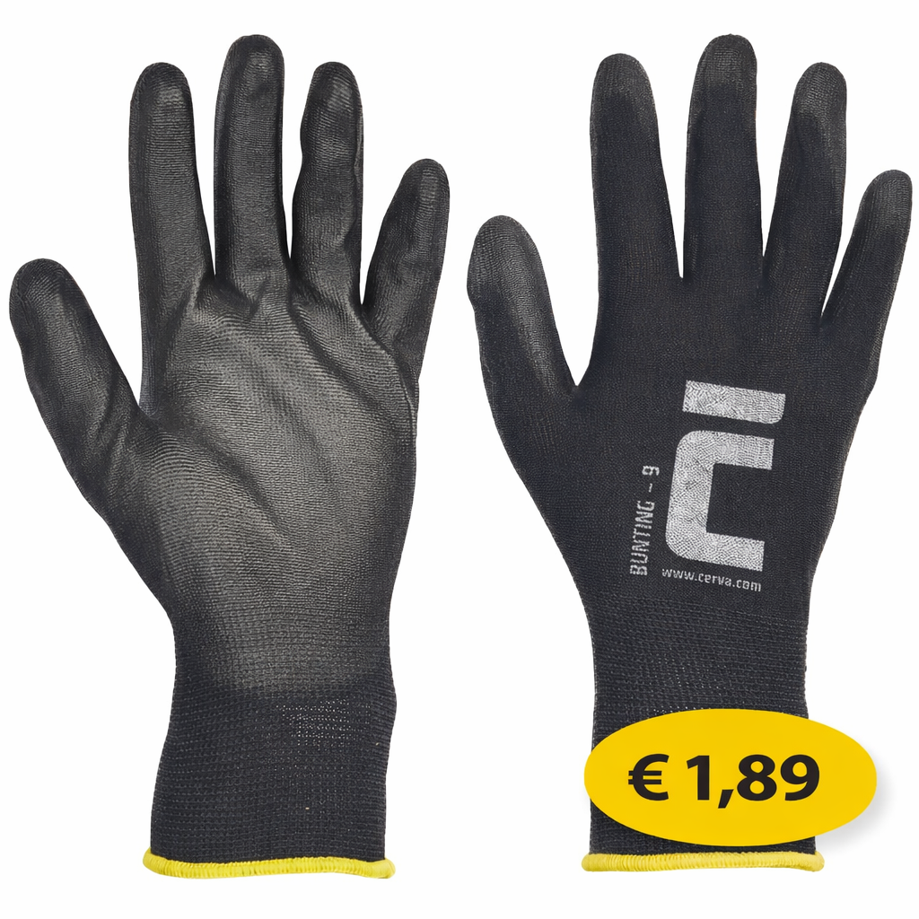 Gebreide naadloze nylon handschoenen met dunne PU laag in de handpalm en op de vingers en elastische manchet.Type; Bunting is leverbaar vanuit voorraad in de maten 8 t/m 11 ( M t/m XXL )