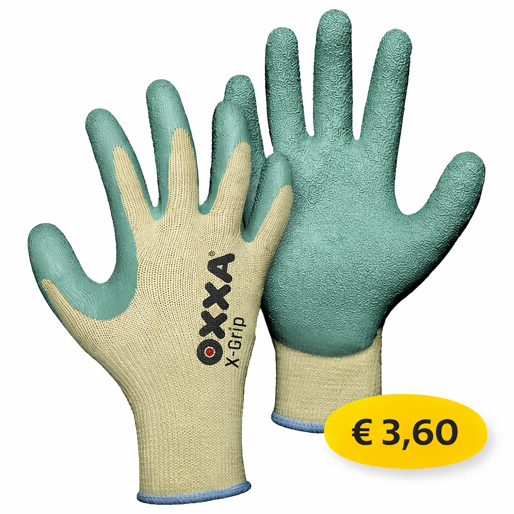 OXXA Latex crinkle-coating, Polyester/katoenen drager, Elastisch gebreid polsmanchet, Naadloze handschoen. is leverbaar vanuit voorraad in de maten 8 t/m 11 ( M t/m XXL )
